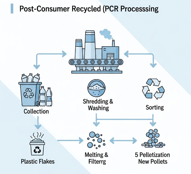 Post-Consumer Recycled (PCR): Haec materia ex fructibus publicis adhibitis et abiectis venit. Haec est materia quae directe aggreditur quaestiones et pollutiones land, et eius retrieval maior est provocatio logistica et technica.