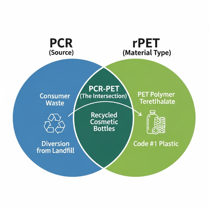 Discrimen inter PCR Cosmeticum Bottellum et rPET Cosmeticum Bottellus est una scopi et originis. Terminus rPET est descriptio technica identitatis chemicae plasticae, cum PCR vexillum est aurum ad suum ethicum principium definiendum.